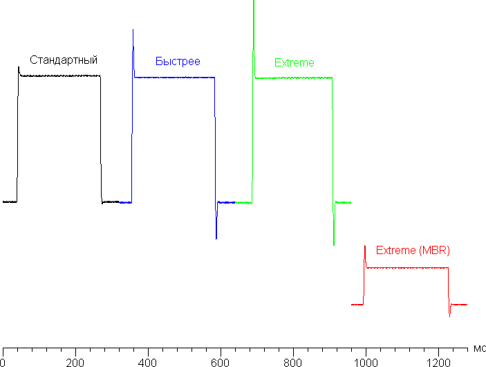 На графиках некоторых переходов есть характерные всплески яркости, которые увеличиваются с ростом разгона. Ниже приведены графики полутонового перехода между оттенками 40% и 60% и обратно (по вертикали — яркость, по горизонтали — время, для наглядности графики выстроены последовательно):