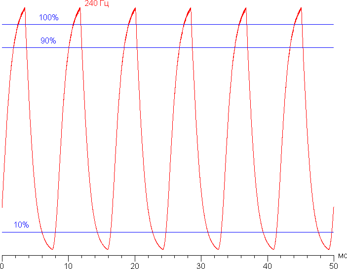 Видно, что при 240 Гц максимальная яркость белого кадра выше уровня 100% от белого (из-за разгона), а минимальная яркость черного кадра ниже 10% от белого. Амплитуда изменения яркости выше 80% от уровня белого. То есть согласно этому формальному критерию скорости матрицы достаточно для вывода изображения с кадровой частотой 240 Гц.