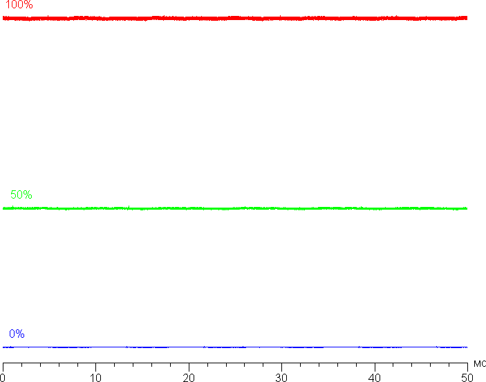 На любом уровне яркости модуляция подсветки отсутствует, что исключает видимое мерцание экрана. Для тех, кто привык распознавать знакомое сокращение, уточним: ШИМ отсутствует. В доказательство приведем графики зависимости яркости (вертикальная ось) от времени (горизонтальная ось) при различных значениях настройки яркости: