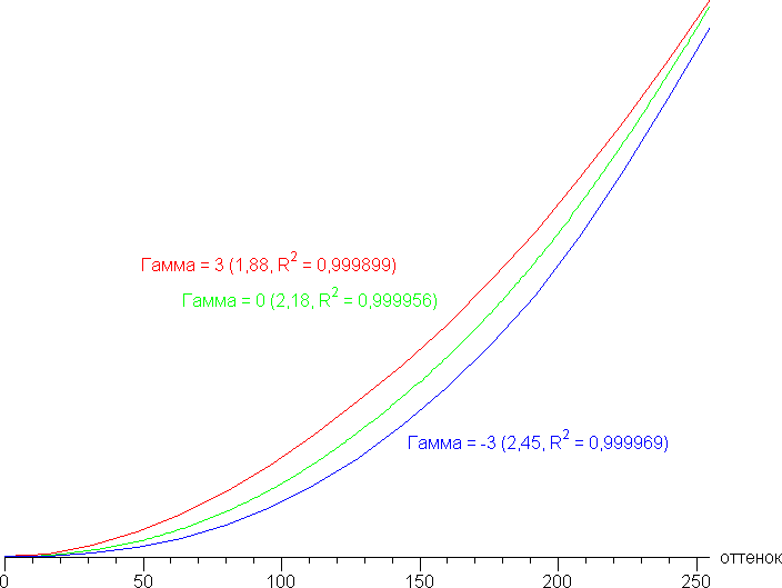 Реальная гамма-кривая зависит от выбранного профиля в списке Гамма — семь значений, от −3 до +3, по умолчанию 0. На графиках значения показателей аппроксимирующей функции приведены в скобках в подписях, там же — коэффициент детерминации: