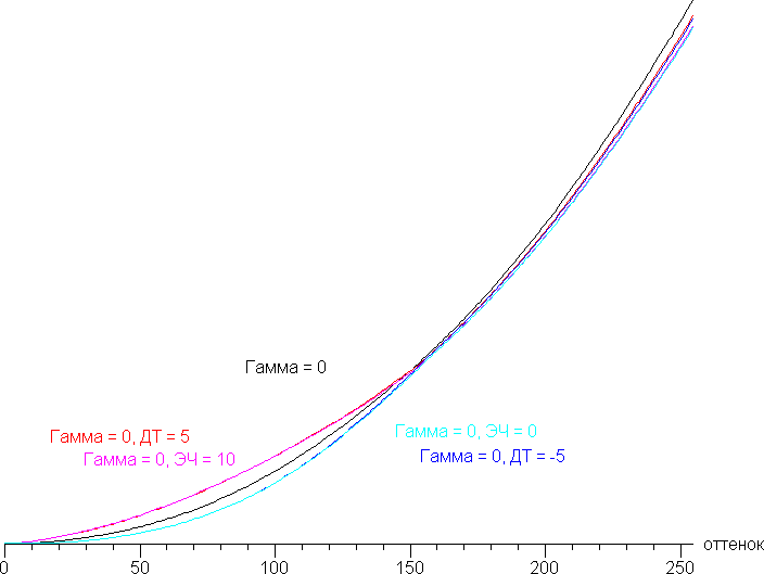 Дополнительной настройкой Эквалайзер черного (значения от 0 до 10, с шагом 1, по умолчанию 5) или Детали теней (значения от −5 до +5, с шагом 1, по умолчанию 0) можно скорректировать гамма-кривую, улучшая или ухудшая различимость деталей в тенях. Первое может быть полезно в играх с темными сценами. Ниже приведены гамма-кривые при крайних значениях этих настроек: