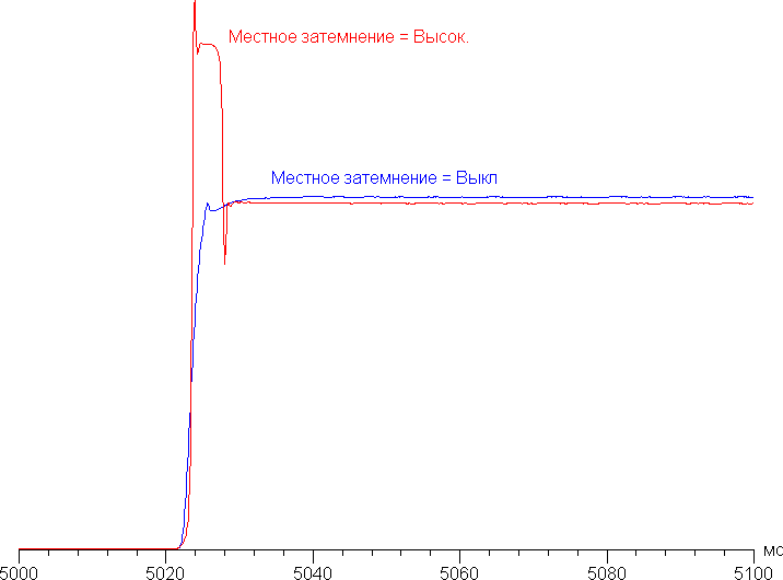 График ниже показывает пример того, как меняется яркость (вертикальная ось) при переключении с черного поля на белое, когда локальная подстройка яркости подсветки выключена и включена: