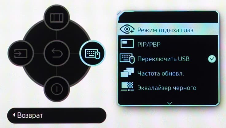 Есть встроенный концентратор USB 3.0 на два порта, для которого входом работает один из двух портов USB-B. Это позволило реализовать функцию KVM — к монитору по USB можно подключить клавиатуру и мышь (а можно и накопитель), чтобы затем их использовать с двумя источниками видеосигнала, например, с ПК и ноутбуком, или с ПК и планшетом. Выбор USB-входа для концентратора происходит автоматически при переключении видеовходов, при этом в меню каждому из четырех видеовходов пользователь назначает первый или второй вход USB-концентратора.