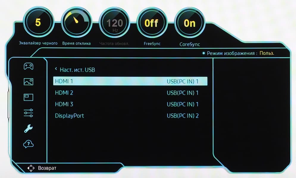 Нажатие на центральную кнопку выводит на экран стартовое меню, из которого можно перейти к выбору входа, запустить пользовательскую функцию, выключить монитор и перейти к основному меню с настройками.