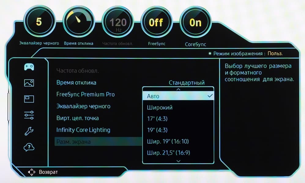 В меню монитора можно подсветку можно включить и выбрать статичный вариант свечения выбранным цветом, один из нескольких динамичных режимов, включая синхронизацию цвета подсветки с цветом того, что выводится на экране, правда в последнем случае все зоны подсветки светятся одним цветом, что не так интересно, как многозонная интерьерная подсветка.