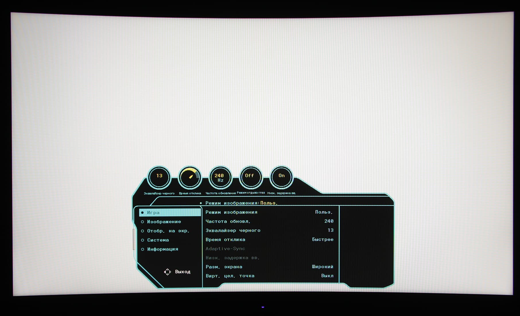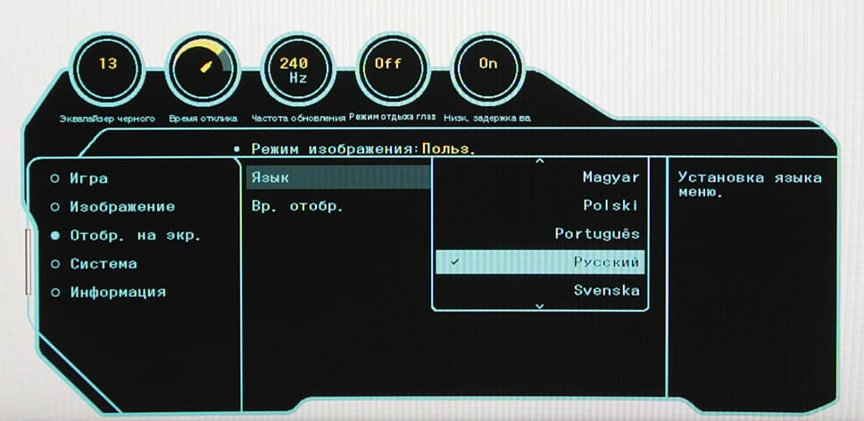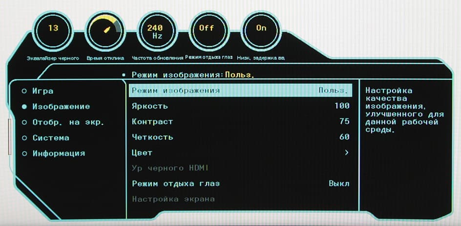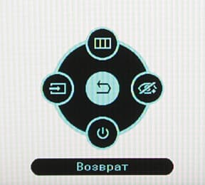 Нажатие на джойстик выводит короткое меню, из которого можно переключиться на другой вход, выключить монитор, включить/выключить режим с низкой интенсивностью синего цвета и перейти к основному меню.