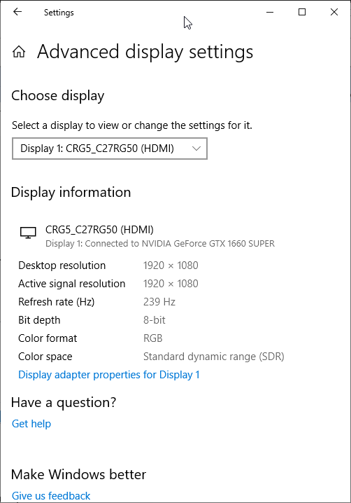 При подключении к компьютеру по DisplayPort и HDMI поддерживалось разрешение до 1920×1080 при 240 Гц кадровой частоты на вход, и вывод изображения на экран также осуществлялся с этой частотой. При таком разрешении и частоте обновления поддерживаются 8 бит на цвет (кодирование RGB).