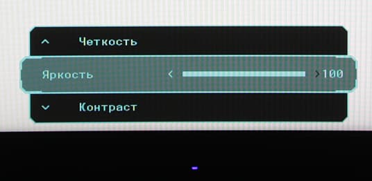 Индикатор состояния неяркий. Он светится синим при работе монитора, или когда монитор выключен (режим выбирается в меню), и мигает синим в режиме ожидания. Навигация по меню быстрая и удобная, чему в немалой степени способствует джойстик. Если сигнал на текущем входе отсутствует, то отклонение джойстика вверх или вниз переключает входы, а долгое нажатие — выключает монитор. Если монитор работает, и на экране нет меню, то отклонение джойстика вверх или вниз выводит на экран меню с тремя основными настройками изображения, а вправо или влево — меню регулировки громкости и отключения звука.