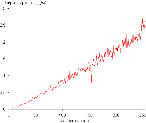 Полученные значения показателей (приведены в скобках в подписях, там же — коэффициент детерминации) позволили определить, что реальная гамма-кривая ближе всего к стандартной в Режим1, поэтому далее мы измерили яркость 256 оттенков серого (от 0, 0, 0 до 255, 255, 255) при этом значении значении. График ниже показывает прирост (не абсолютное значение!) яркости между соседними полутонами: