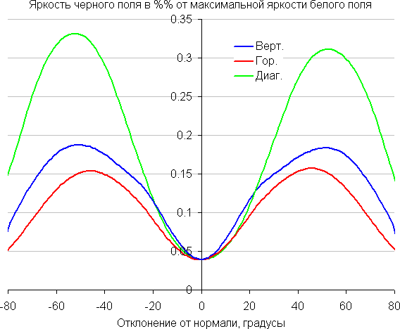 Отметим примерно одинаковый характер уменьшения яркости при отклонении от перпендикуляра к экрану во всех трех направлениях, при этом графики не пересекаются в очень широком диапазоне измеряемых углов. При отклонении в диагональном направлении яркость черного поля растет немного быстрее, чем в двух других случаях. Однако максимум яркости черного поля все равно меньше, чем в случае типичного монитора на матрице IPS. Контрастность в диапазоне углов ±82° приближается к отметке 10:1 только при отклонении по диагонали, но все равно эту границу не пересекает.
