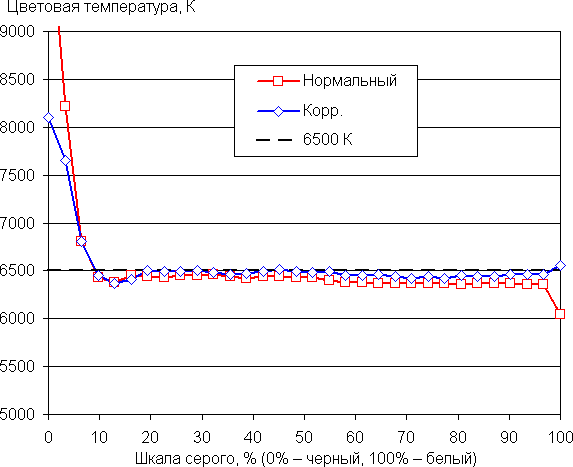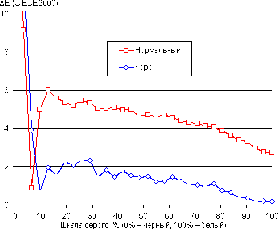 Самый близкий к черному диапазон можно не учитывать, так как в нем цветопередача не так важна, а погрешность измерения цветовых характеристик высокая. Ручная коррекция мало повлияла на цветовую температуру, но уменьшила как абсолютное значение ΔE в среднем, так и вариацию этого параметра от оттенка к оттенку. Также положительно повлияло снижение значения настройки Контраст с 75 до 68 — тон белого стал меньше отличаться от светлых оттенков серого. Впрочем, для бытового применения просто выбрать профиль Нормальный уже достаточно.