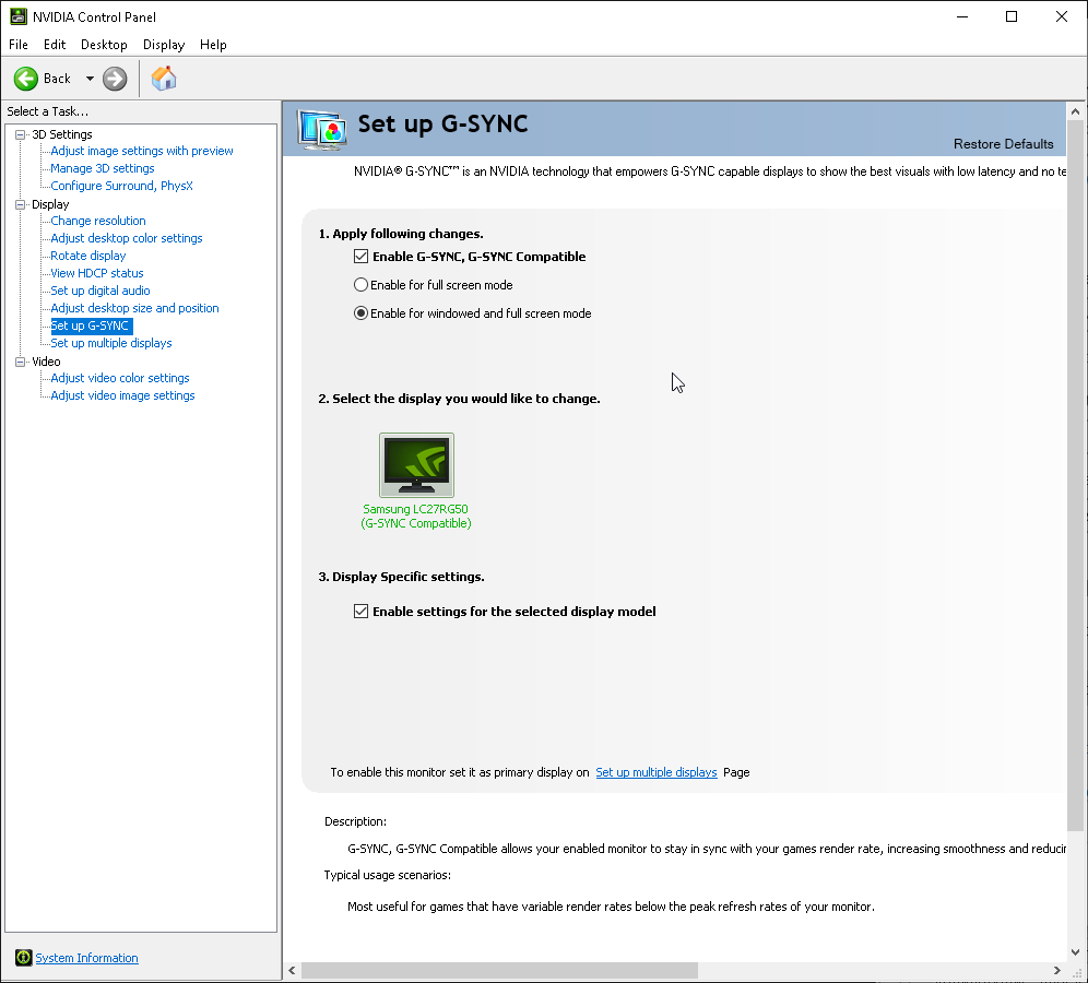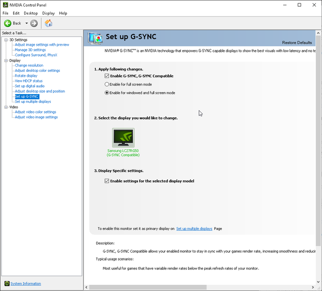 С видеокартами Nvidia этот монитор поддерживает G-Sync в режиме G-Sync Compatible. Диапазон поддерживаемых частот, как указано на сайте Nvidia, равен 48—240 Гц. Для проверки мы использовали видеокарту GeForce GTX 1660 Super. G-Sync работает при подключении по DisplayPort: на панели настройки видеокарты доступна соответствующая опция, в утилите G-Sync Pendulum Demo режим G-Sync включается.