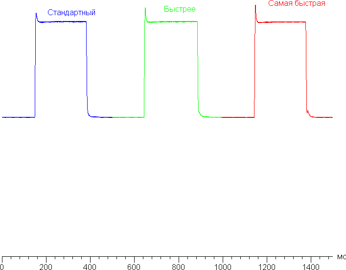 Видно, что при изменении от Стандартный до Самая быстрая пик яркости на фронте включения увеличивается. Это приводит с снижению времени включения для этого перехода от 3,1 мс до 2,6 мс, однако усредненные значения времен отклика практически не меняются, так как скорость каких-то переходов немного увеличивается, а каких-то — немного уменьшается. Поэтому от разгона особого толка нет. С нашей точки зрения, скорости матрицы достаточно даже для самых динамичных игр. В подтверждение приведем зависимость яркости от времени при чередовании белого и черного кадра при 240 Гц кадровой частоты (график с подписью 240 Гц, разгон максимальный):
