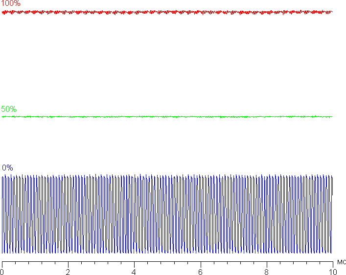 Яркость монитора меняется именно яркостью подсветки, то есть без ущерба для качества изображения (сохраняется контрастность и количество различимых градаций) яркость монитора можно менять в широких пределах, что позволяет с комфортом работать, играть и смотреть фильмы как в освещенном, так и в темном помещении. Только на низком уровне яркости (где-то ниже 20%) появляется значимая модуляция подсветки. Однако очень высокая частота этой модуляции — порядка 12 кГц — полностью исключает видимое мерцание экрана. Приведем графики зависимости яркости (вертикальная ось) от времени (горизонтальная ось) при различных значениях настройки яркости: