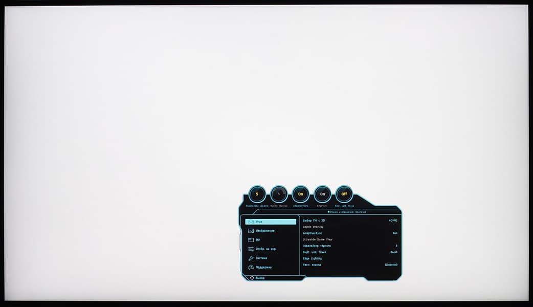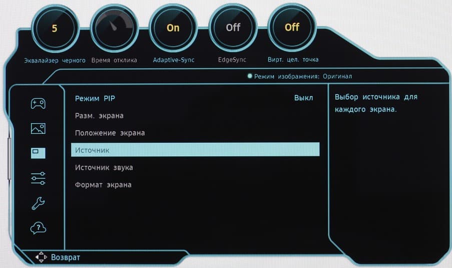 Нажатие на джойстик выводит на экран стартовое меню, из которого можно перейти к выбору входа, запустить пользовательскую функцию, выключить монитор и перейти к основному меню с настройками.