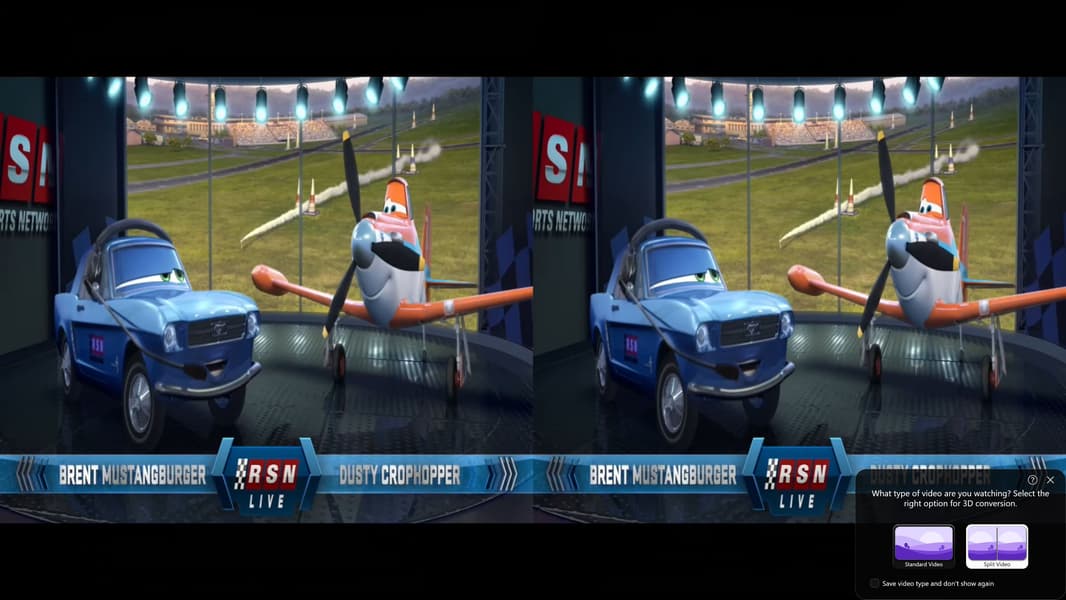 Кроме того поддерживается воспроизведение видео в формате горизонтальная стереопара. При запуске видео в поддерживаемом плеере пользователь может выбрать или это обычное видео, и тогда включается интеллектуальное преобразование в 3D (см. выше), или это горизонтальная стереопара, тогда ракурсы просто выводятся как есть в итоговом изображении: