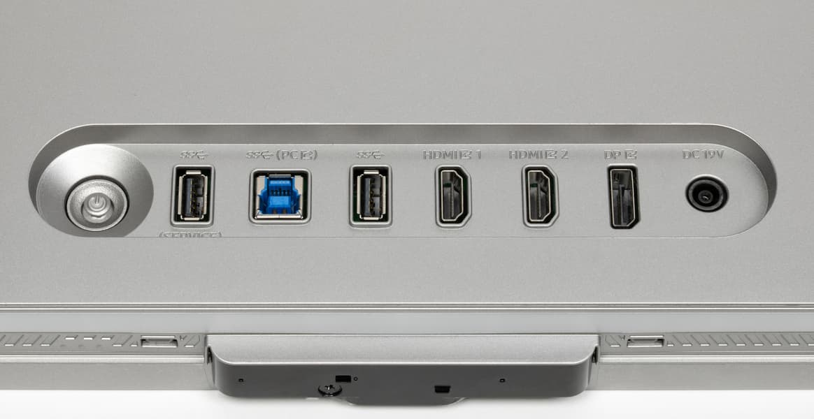 Разъем питания и все интерфейсные разъемы расположены в неглубокой нише сзади и ориентированы назад. Там же находится 5-позиционный джойстик (отклонение по четырем направлениям и нажатие). Подключать кабели к этим разъемам относительно удобно. Кабели, идущие от этих разъемов, можно пропустить через отверстие в стойке подставки — так сзади монитор выглядит аккуратнее.