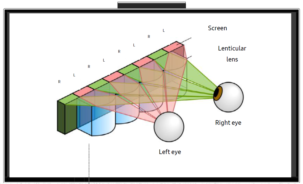 Выше мы представили результаты тестирования Samsung Odyssey 3D G90XF как обычного игрового монитора на матрице типа IPS. Можно сделать вывод о том, что перед нами типичный современный игровой монитор высокого класса. Однако главная особенность этого монитора в том, что он поддерживает работу в стереоскопическом режиме (или как обычно его называют маркетологи 3D-режиме). Напомним, что стереоскопическое изображение получается, если для каждого глаза тем или иным способом формируется свое изображение, в котором положение и ракурс предметов различаются в зависимости от того, на каком расстоянии от зрителя этот предмет располагается. В итоге мозг формирует объемную стереоскопическую картинку. Согласно представленным нам материалам, за формирование двух изображений для двух глаз отвечают цилиндрические микролинзы, расположенные перед ЖК-матрицей: