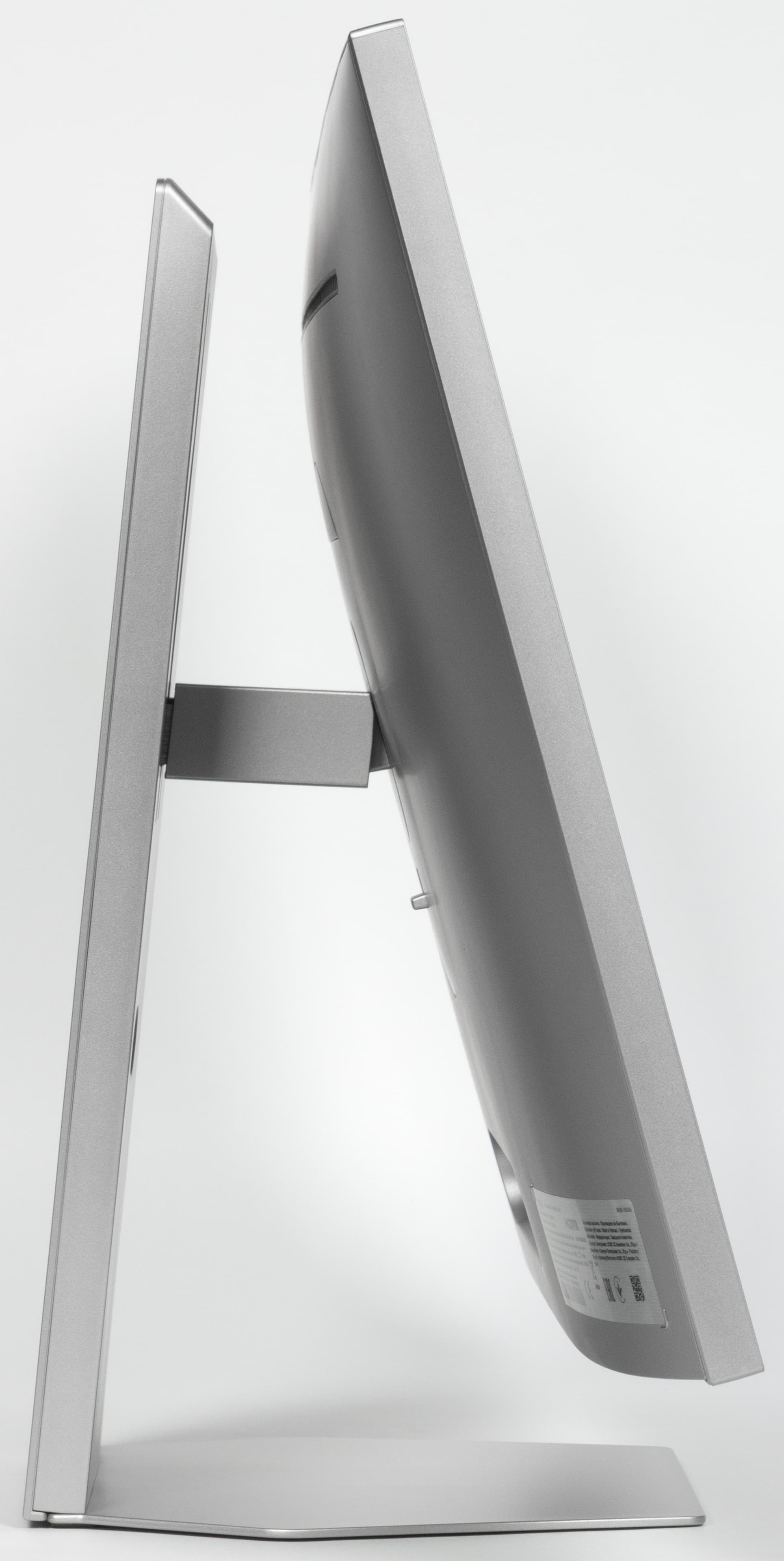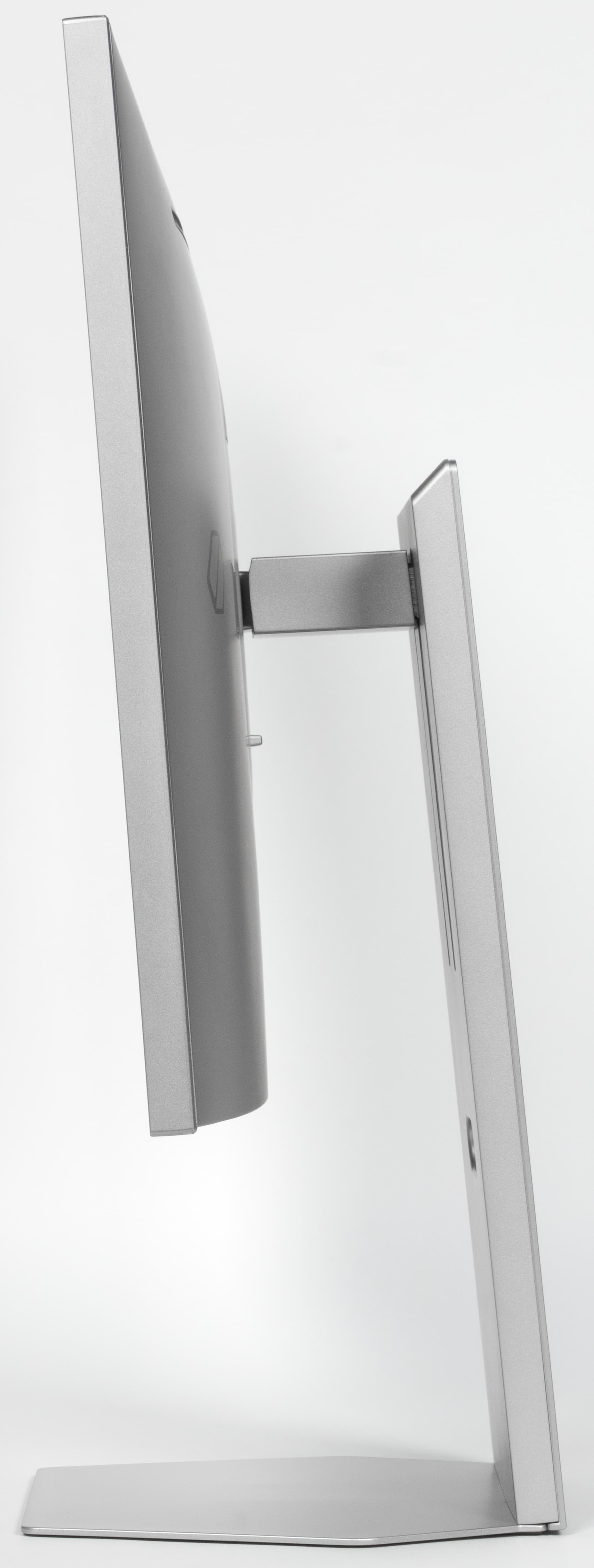 Стойка имеет фиксированную высоту, но подпираемый пружиной механизм с рельсовыми направляющими обеспечивает вертикальное перемещение узла, на который крепится блок экрана. В итоге экран можно установить на нужную высоту. Подставка позволяет наклонять блок экрана вперед от вертикального положения и больше наклонять назад, а также переворачивать в портретную ориентацию по и против часовой стрелки.