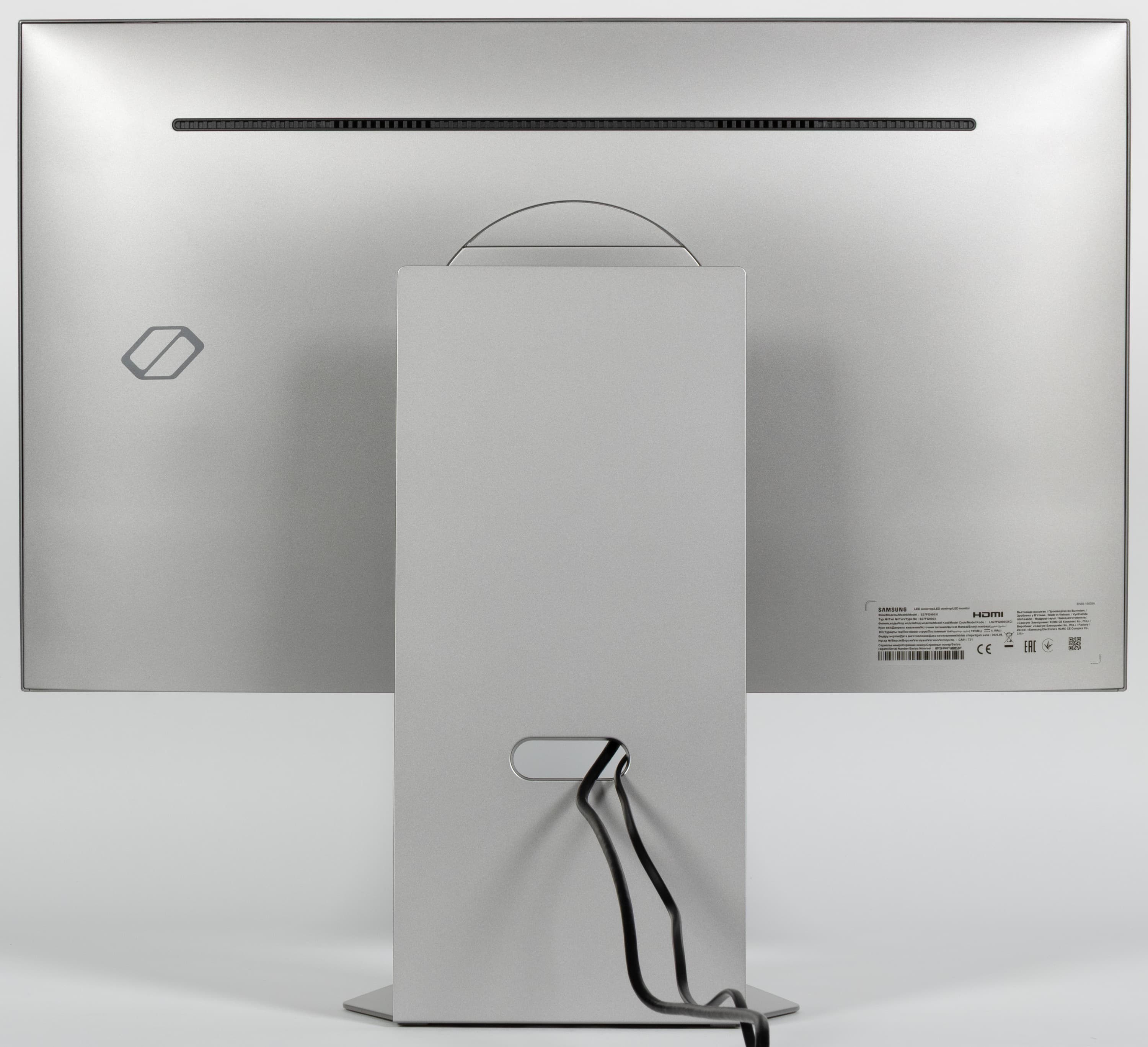 Вентиляционные решетки есть в верхней части на задней панели и на нижнем торце. Снизу за разнесенными от центра решетками расположены встроенные в монитор громкоговорители. Также в нижний торец встроена полоска из полупрозрачного белого пластика, за которой находится несколько RGB-светодиодов. Эту декоративную подсветку спереди не видно, она освещает только поверхность под монитором. В меню настроек монитора можно выбрать статичный вариант свечения с заданным цветом, один из динамичных или режим повторения цветов нижней части выводимого на экран изображения.