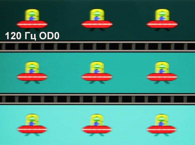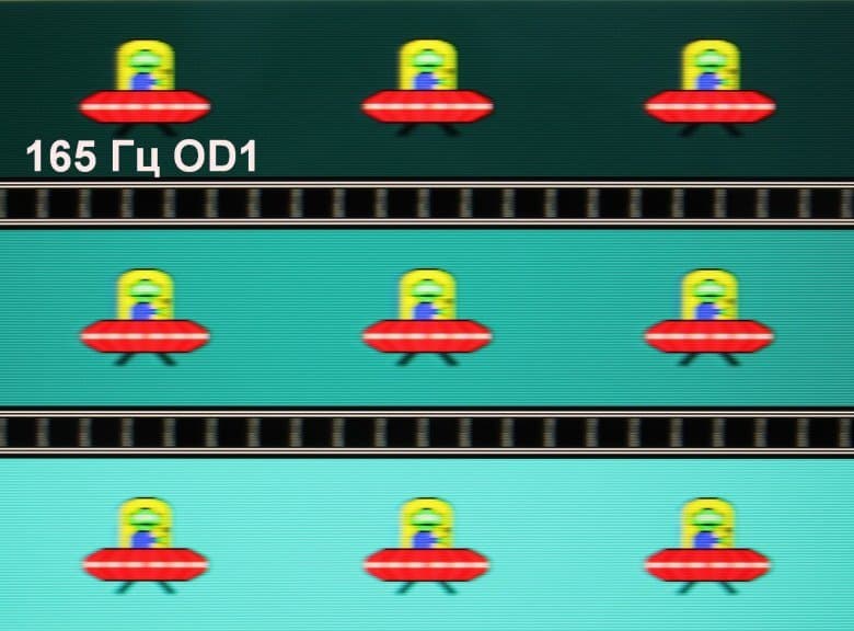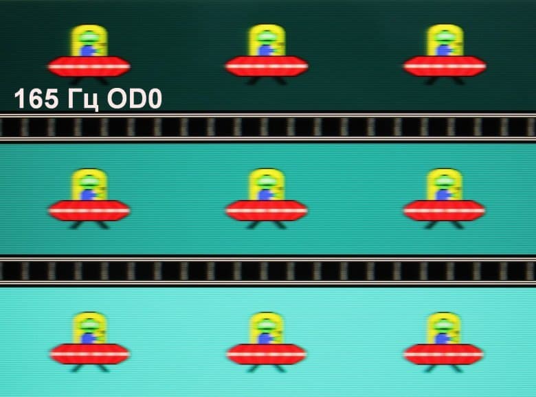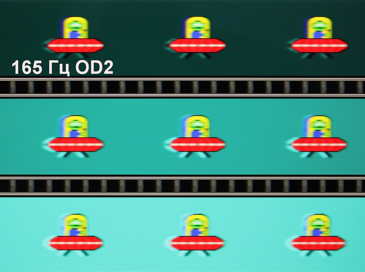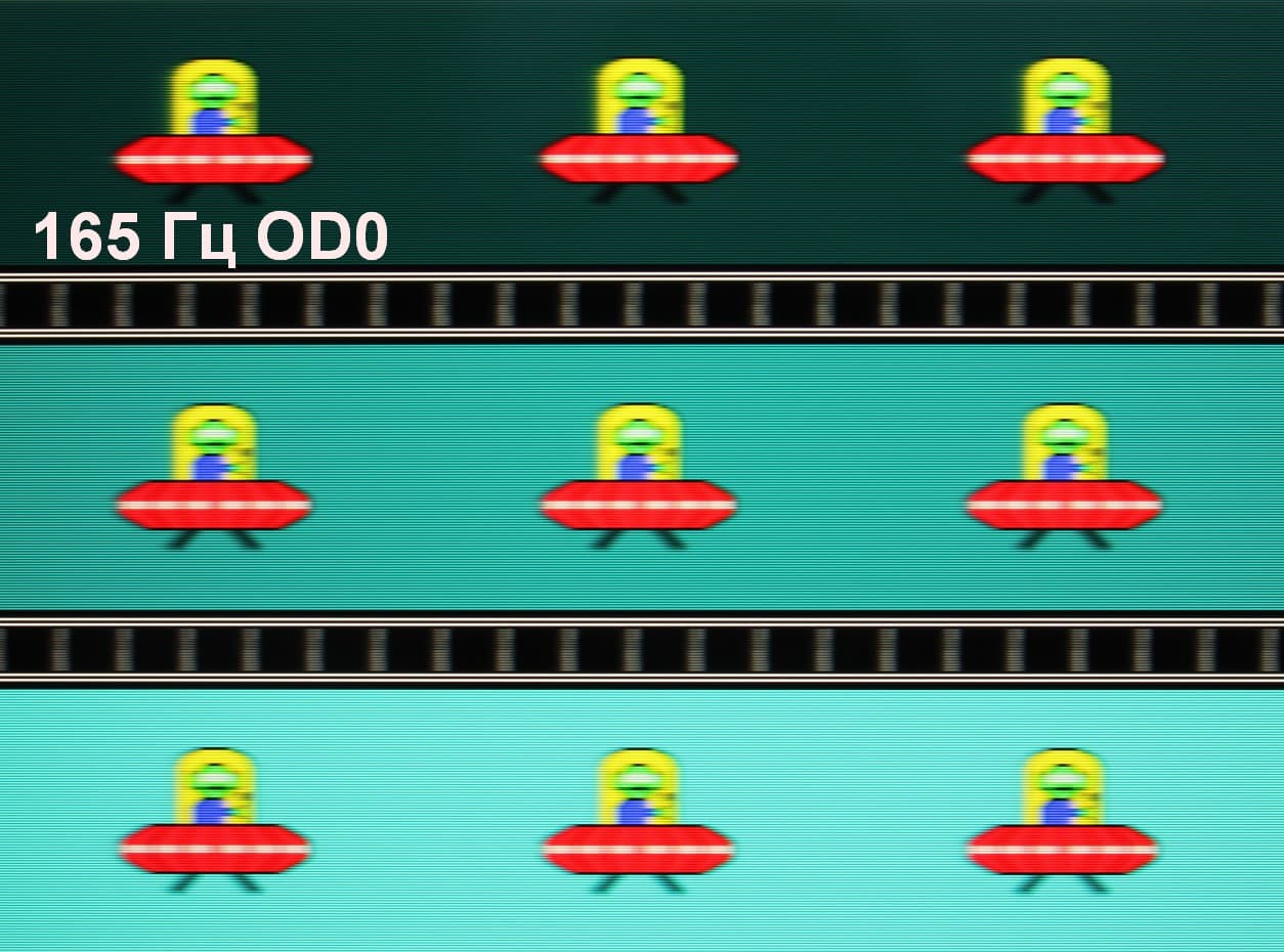 Для наглядного представления о том, что на практике означает такая скорость матрицы, и какие могут быть артефакты от разгона, приведем серию снимков, полученных с помощью движущейся камеры. Такие снимки показывают, что видит человек, если он следит глазами за двигающимся на экране объектом. Описание теста приведено тут, страница с самим тестом тут. Использовались рекомендованные установки (скорость движения 960 пиксель/с для частот обновления 60 и 120 Гц или 990 пиксель/с для 165 Гц, то есть на целое число пикселей за кадр), выдержка 1/15 с. На фотографиях указаны значения частоты обновления, а также включен ли разгон (ODx; x = 0 — 2).