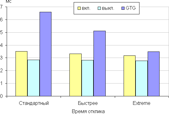 Время отклика зависит от значения одноименной настройки, которая управляет разгоном матрицы. Диаграмма ниже показывает, как меняется время включения и выключения при переходе черный-белый-черный (столбики «вкл.» и «выкл.»), а также среднее суммарное время для переходов между полутонами (столбики GTG):