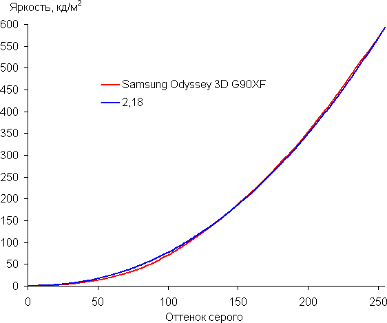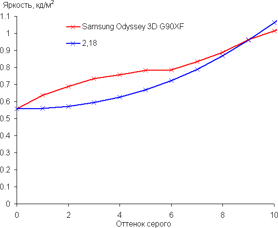 Рост прироста яркости весьма равномерный. При этом почти каждый следующий оттенок значимо ярче предыдущего. Только в самой темной области два оттенка серого друг от друга по яркости практически не различаются, что не принципиально. Зато другие оттенки в тенях хорошо различаются, что для игрового монитора важно: