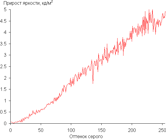Мы измерили яркость 256 оттенков серого (от 0, 0, 0 до 255, 255, 255) при настройке Гамма = −2 (при этом значении гамма-кривая ближе всего к стандартной). График ниже показывает прирост (не абсолютное значение!) яркости между соседними полутонами:
