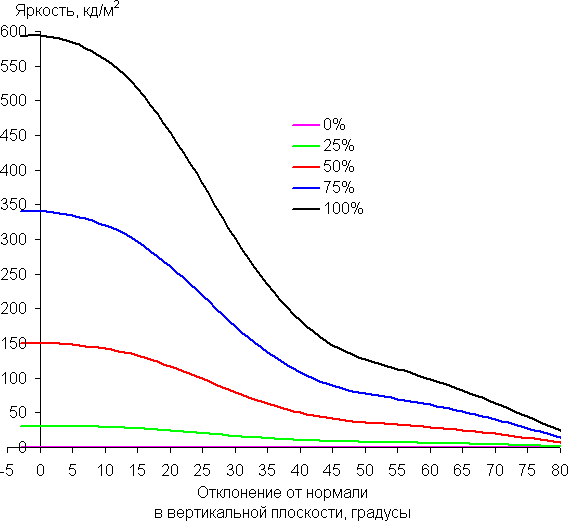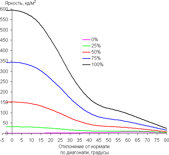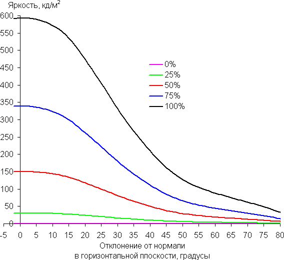 Углы обзора по снижению яркости не очень широкие. При отклонении в диагональном направлении яркость черного поля начинает резко возрастать уже при 20° отклонения от перпендикуляра к экрану, и возрастает максимум до примерно 5,8% от максимальной яркости белого поля. Даже для матрицы типа IPS это очень высокое значение. Если сидеть не очень далеко от экрана, то черное поле по углам будет заметно светлее, чем в центре (оставаясь примерно нейтрально-серым по оттенку). Контрастность в случае отклонения по диагонали опускается ниже отметки 10:1 при отклонении более чем на 74°.