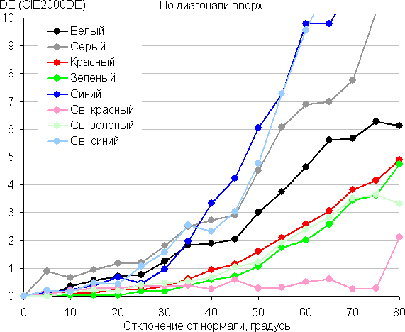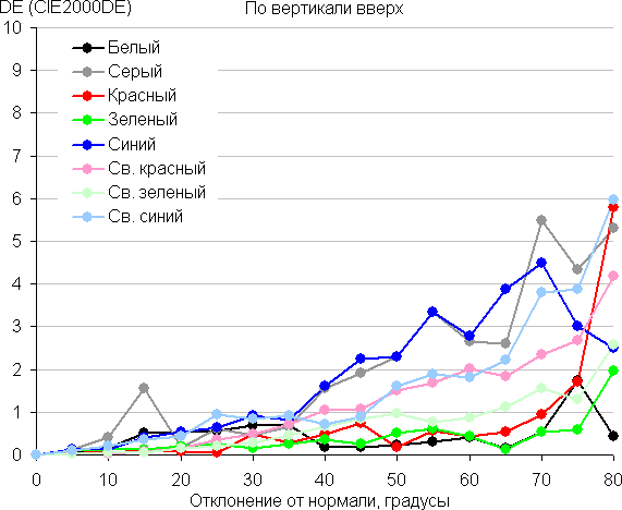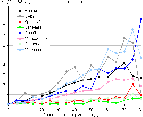Для количественной характеристики изменения цветопередачи мы провели колориметрические измерения для белого, серого (127, 127, 127), красного, зеленого и синего, а также светло-красного, светло-зеленого и светло-синего полей во весь экран с использованием установки, подобной той, что применялась в предыдущем тесте. Измерения проводились в диапазоне углов от 0° (датчик направлен перпендикулярно к экрану) до 80° с шагом в 5°. Полученные значения интенсивностей были пересчитаны в ΔE относительно замера каждого поля при перпендикулярном положении датчика относительно экрана. Результаты представлены ниже: