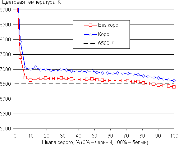 Графики ниже показывают цветовую температуру на различных участках шкалы серого и отклонение от спектра абсолютно черного тела (параметр ΔE) в случае отсутствия какой-либо коррекции (подписано — Без корр.) и после коррекции цветового баланса (0/−5/−18 для усиления красного/зеленого/синего — Корр.):