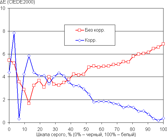Самый близкий к черному диапазон можно не учитывать, так как в нем цветопередача не так важна, а погрешность измерения цветовых характеристик высокая. Цветовой баланс во всех двух случаях хороший, так как цветовая температура достаточно близка к стандартным 6500 К и отклонение от спектра абсолютно черного тела (ΔE) ниже 10 единиц, что для потребительского устройства считается приемлемым показателем. При этом оба параметра мало изменяются на различных участках шкалы серого, что улучшает визуальное восприятие цветового баланса. Видно, что простой корректировкой цветовой баланс не удается значительно улучшить из-за вариации цветовой температуры и ΔE.