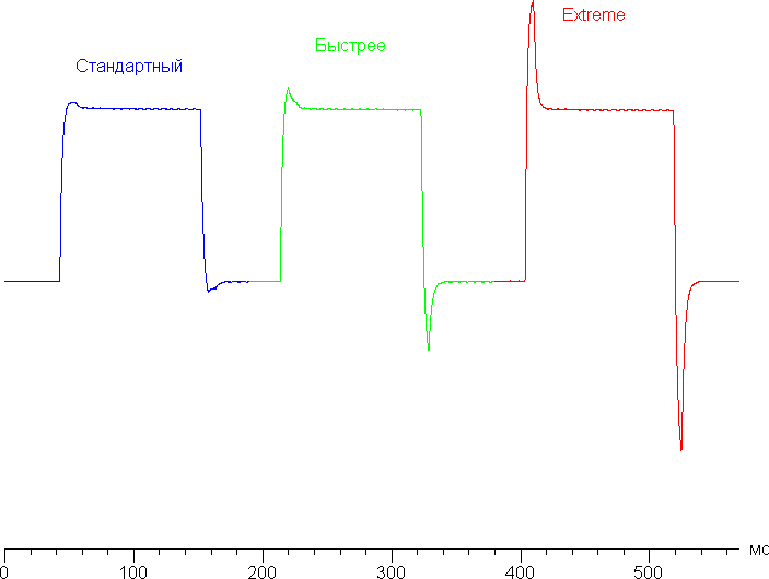 Ниже приведены графики полутонового перехода между оттенками 70% и 90% и обратно при различных значениях данной настройки (по вертикали — яркость, по горизонтали — время, для наглядности графики выстроены последовательно):
