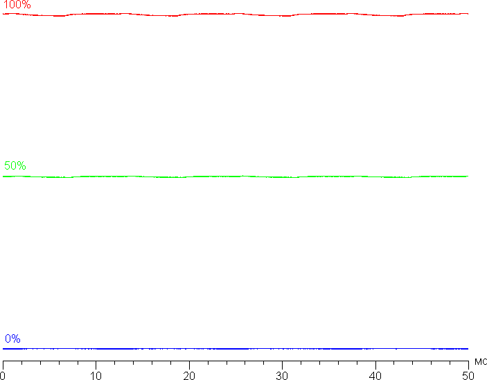 На любом уровне яркости модуляция подсветки отсутствует, что исключает видимое мерцание экрана. Для тех, кто привык распознавать знакомое сокращение, уточним: ШИМ отсутствует. В доказательство приведем графики зависимости яркости (вертикальная ось) от времени (горизонтальная ось) при различных значениях настройки яркости: