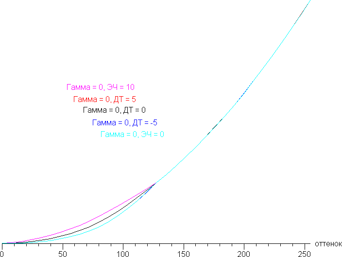 Дополнительной настройкой Эквалайзер черного (значения от 0 до 10, с шагом 1, по умолчанию 5) или Детали теней (значения от −5 до +5, с шагом 1, по умолчанию 0) можно скорректировать гамма-кривую, улучшая или ухудшая различимость деталей в тенях. Первое может быть полезно в играх с темными сценами. Ниже приведены гамма-кривые при крайних значениях этих настроек:
