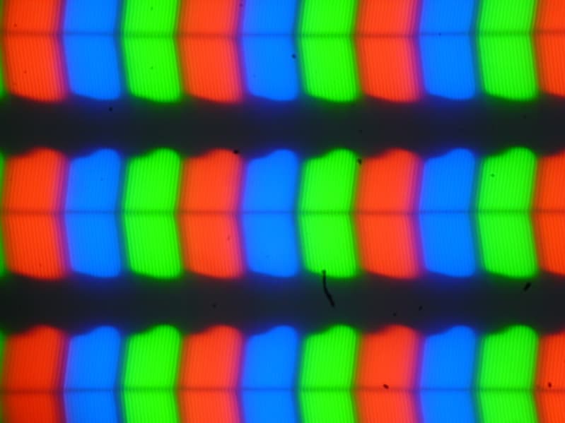На микрофотографии ниже можно разглядеть типичную для IPS структуру в виде параллельных полосок, а также, что каждый субпиксель делится на два примерно равных домена (черные точки — это пыль на матрице фотоаппарата):