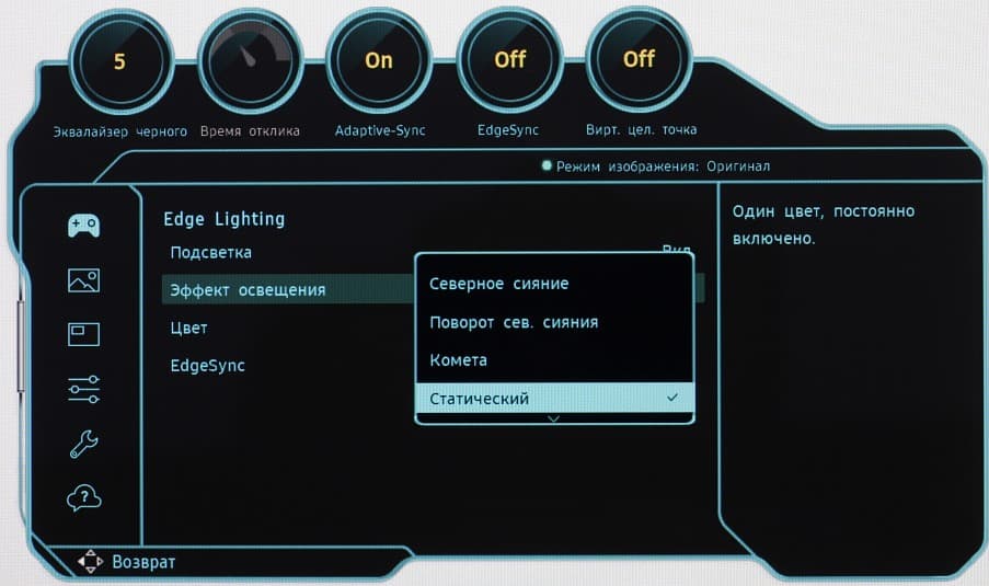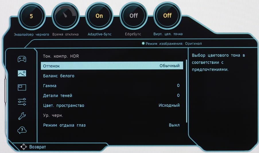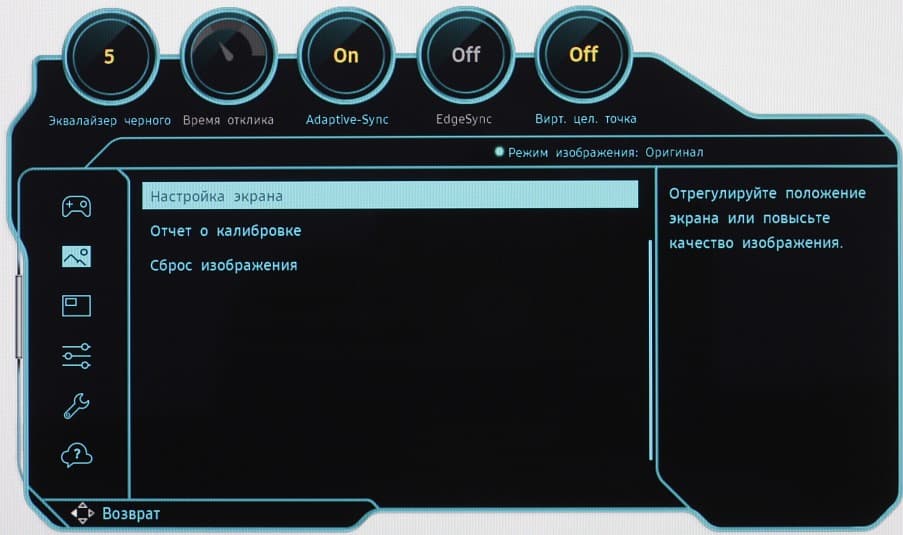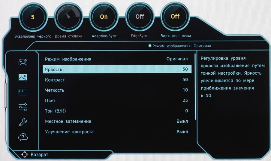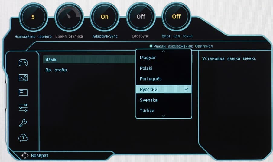 Навигация удобная, к тому же списки зациклены. При изменении некоторых настроек изображения основное меню убирается с экране, остается только ползунок с настройкой или короткий список с ползунками. Это облегчает оценку вносимых изменений. Можно выбрать задержку автоматического выхода из меню. Присутствует русская версия экранного меню.