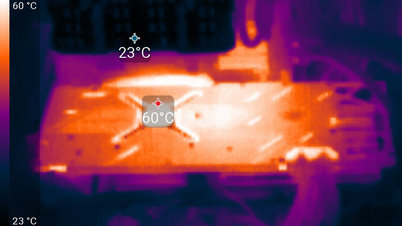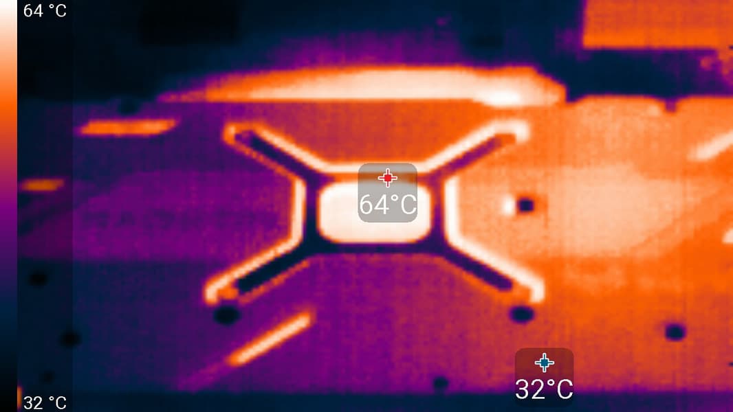 После 6-часового прогона под нагрузкой максимальная температура ядра не превысила 72 °C, что является нормальным результатом для видеокарт такого уровня. Максимальная мощность была зафиксирована на уровне 289 Вт, а максимальный нагрев наблюдался в центре PCB, и основным источником нагрева является графический процессор.
