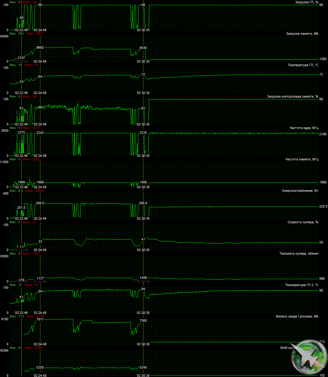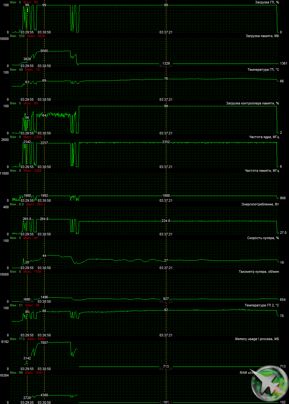 При описанном выше ручном разгоне параметры работы карты почти не менялись, максимальное потребление вырастало до 293 Вт.
