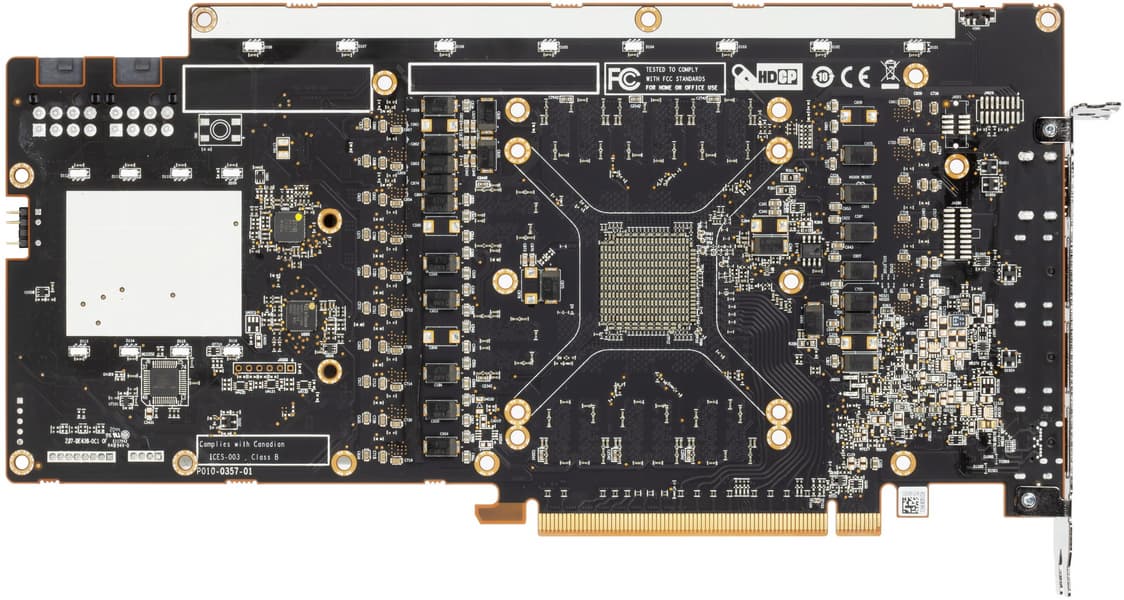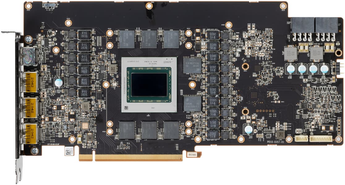 Печатная плата очень сложная, имеет более десяти слоев, включая 4 медных. Также мы видим, что у карты общепринятый набор видеовыходов: 1 HDMI + 3 DP (анонсированный у референс-карты вывод USB Type-C в данном случае не используется).
