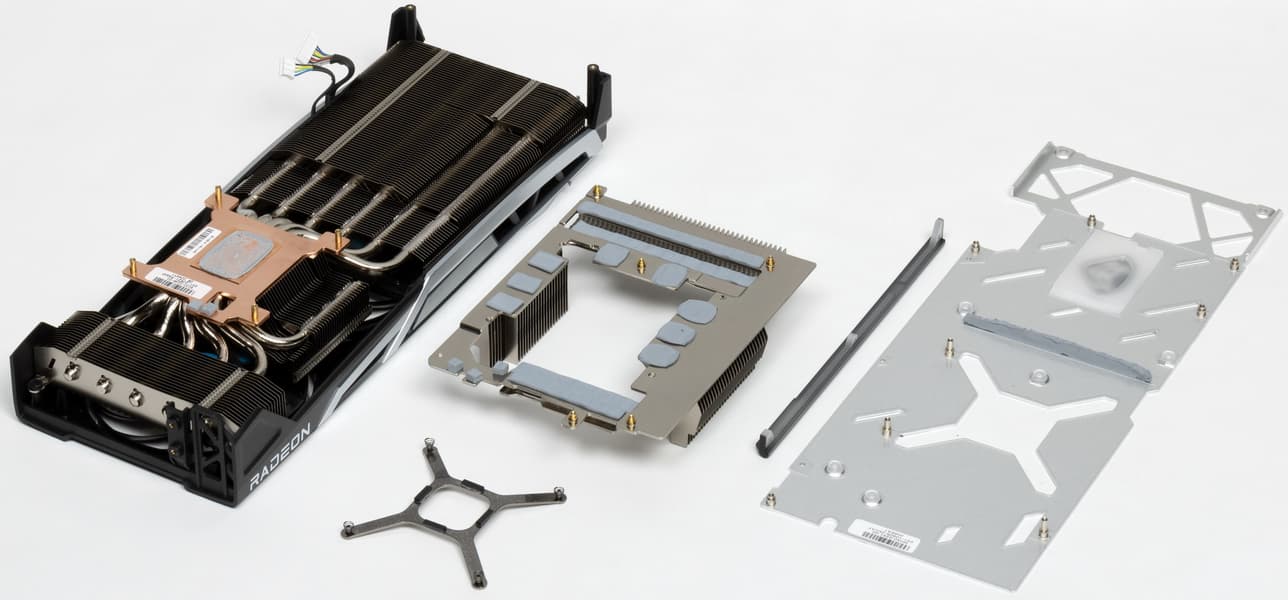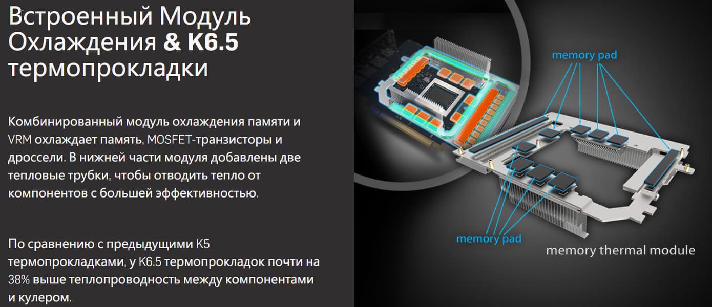 Для микросхем памяти и компонентов преобразователей питания VRM есть свой отдельный модуль (его даже сложно назвать рамой или радиатором из-за сложной формы).