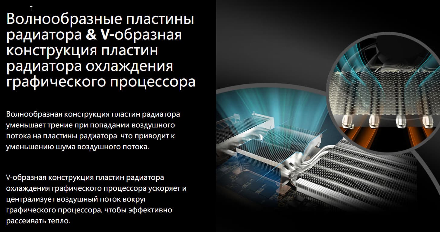 СО использует массивный пластинчатый никелированный радиатор с тепловыми трубками, припаянными к медной подошве прямого контакта с GPU.