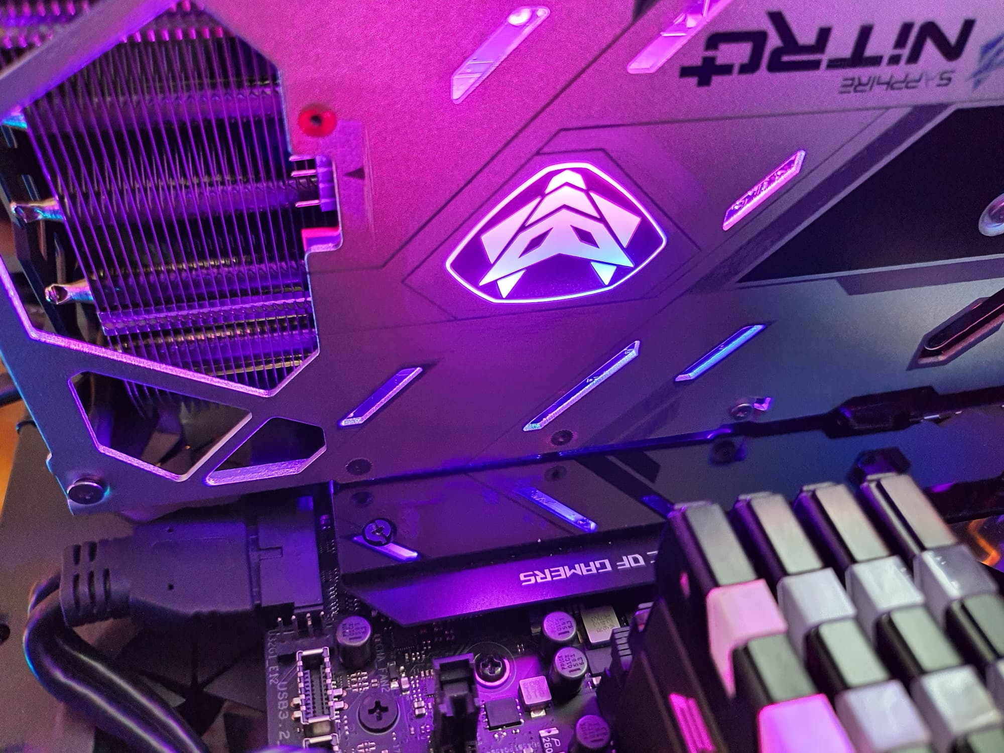 Можно организовать очень неплохие световые эффекты совместно с материнской платой и/или корпусными вентиляторами, а также СО центрального процессора. Кроме того, к ARGB-разъему (5 В) на торце платы можно подключить кабель для синхронизации подсветки с материнской платой.