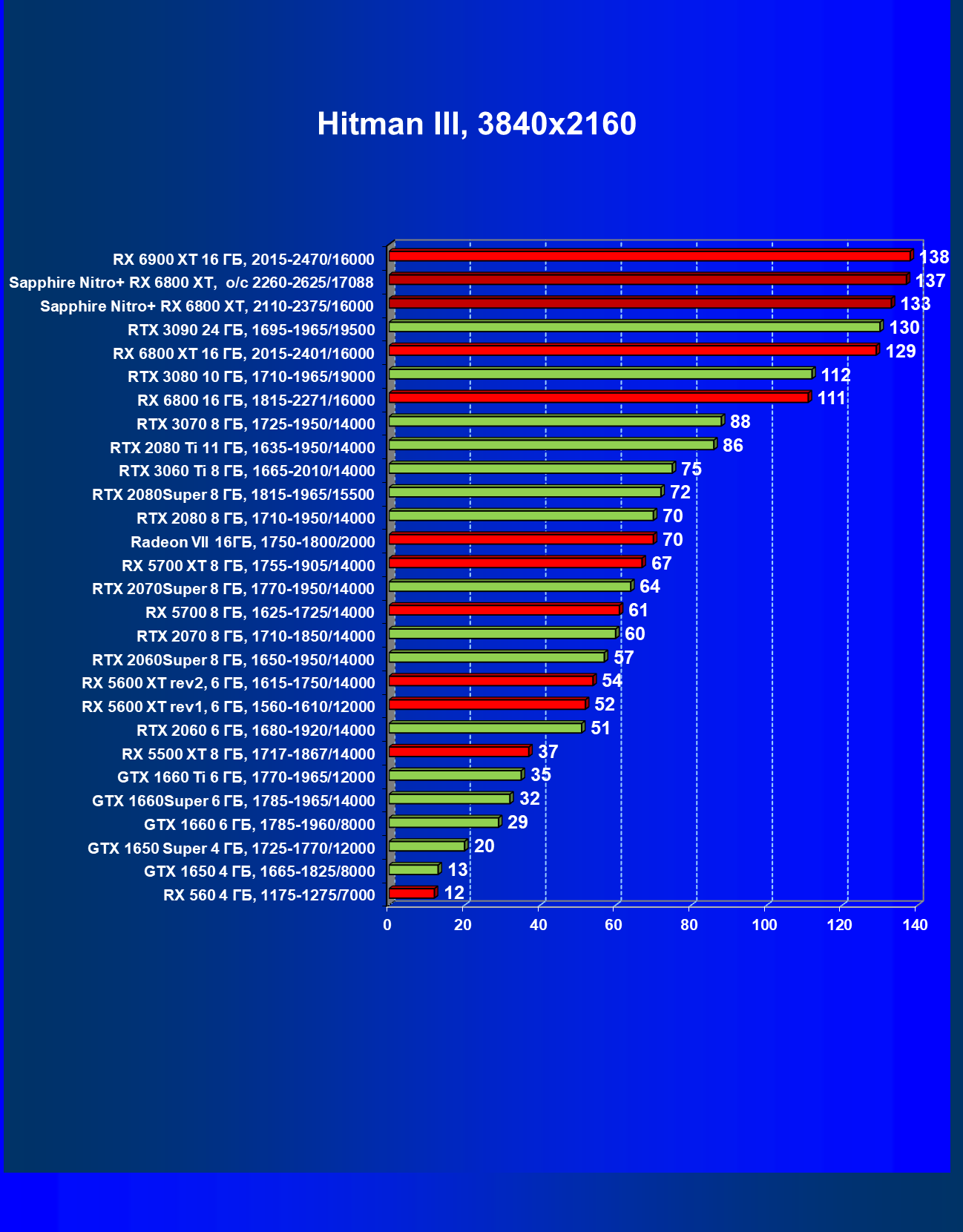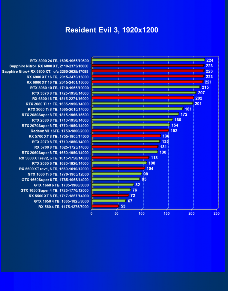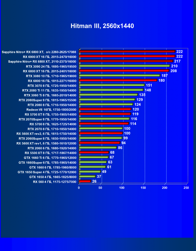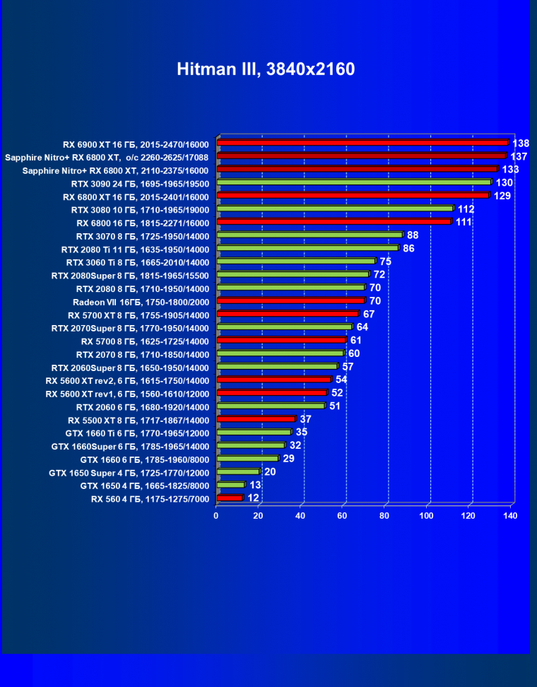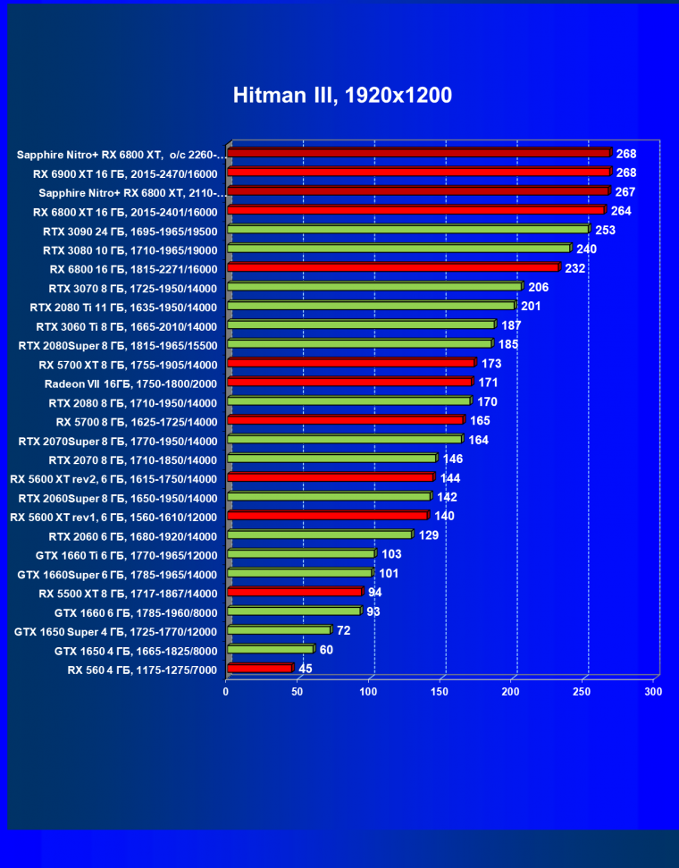 После обновления драйверов (и добавления в наш тестовый набор игры Hitman III) Radeon RX 6800 XT в лице референс-карты стал чуть-чуть опережать GeForce RTX 3080 в среднем, а небольшой фабричный разгон карты Sapphire позволил этой карте в режиме Performance Mode стать лидером своей группы.