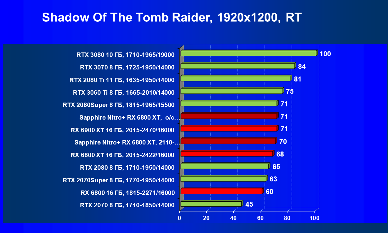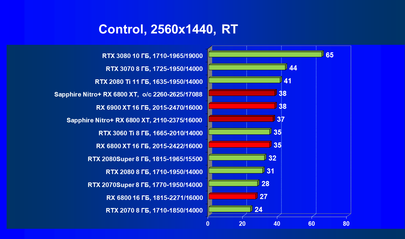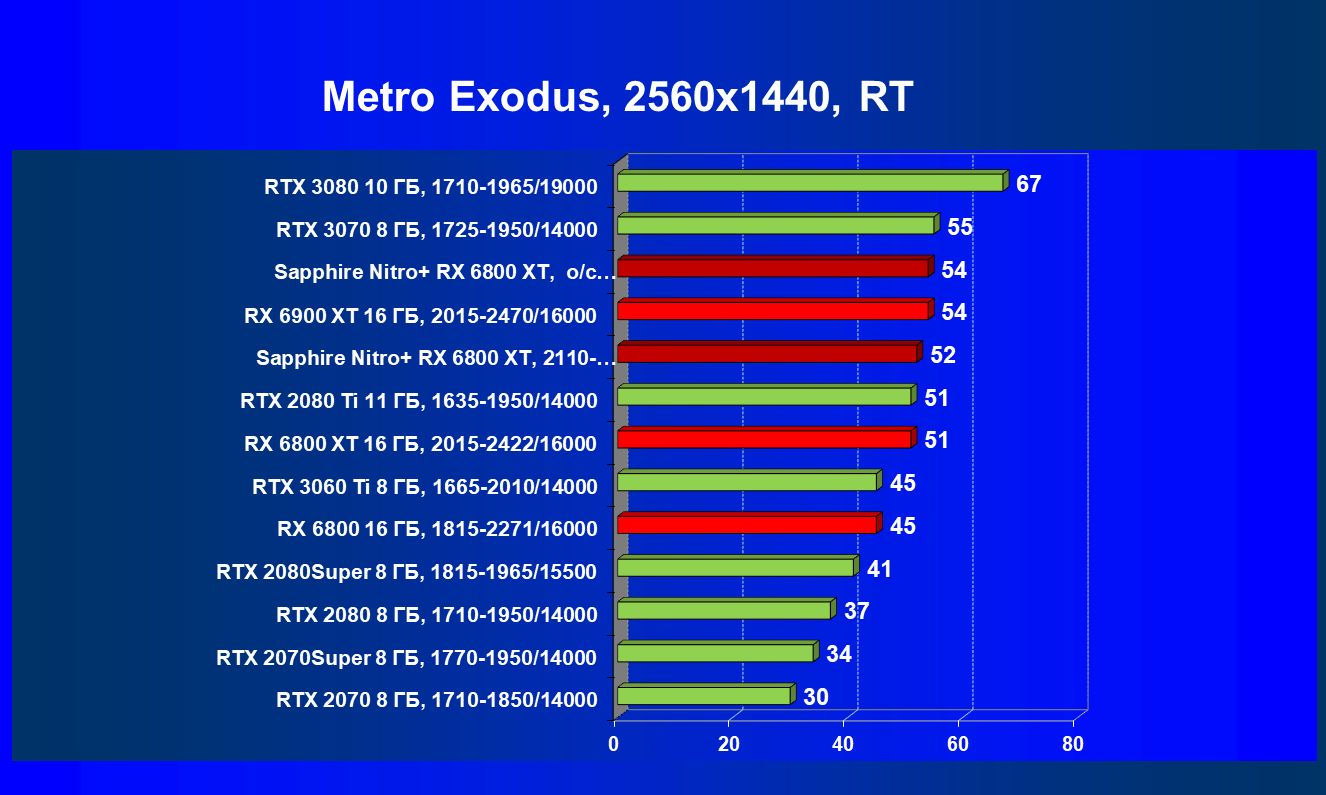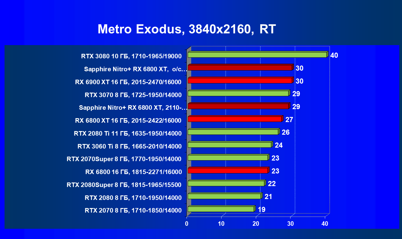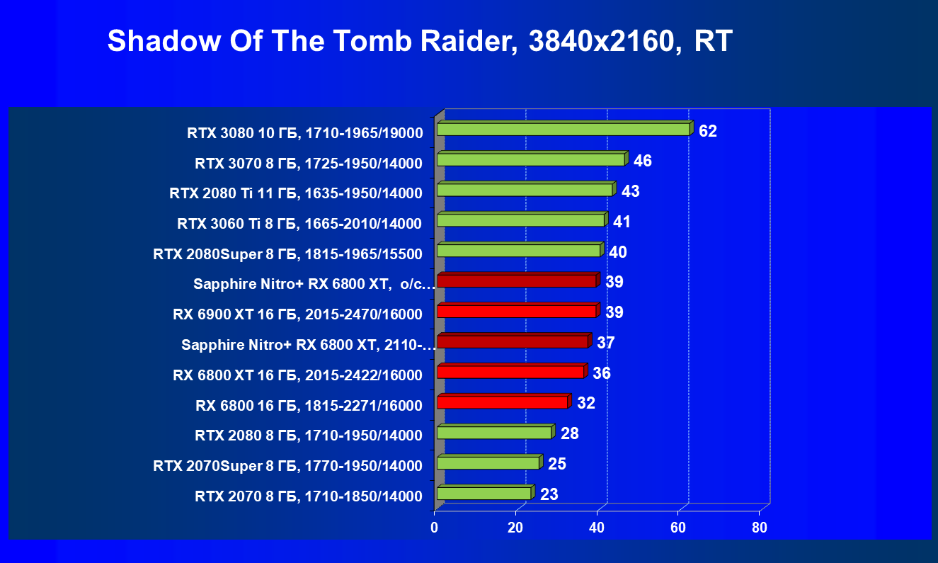 Nvidia GeForce RTX 3080 и AMD Radeon RX 6800 XT являются прямыми соперниками, они демонстрируют почти равную производительность, позволяющую комфортно играть в 4К при максимальных настройках графики, но только в игры без использования трассировки лучей (RT) — при включении трассировки лучей производительность Radeon 6800 XT может упасть до уровня GeForce RTX 3060 Ti. Видеокарта Sapphire немного более производительная, чем референсный аналог.