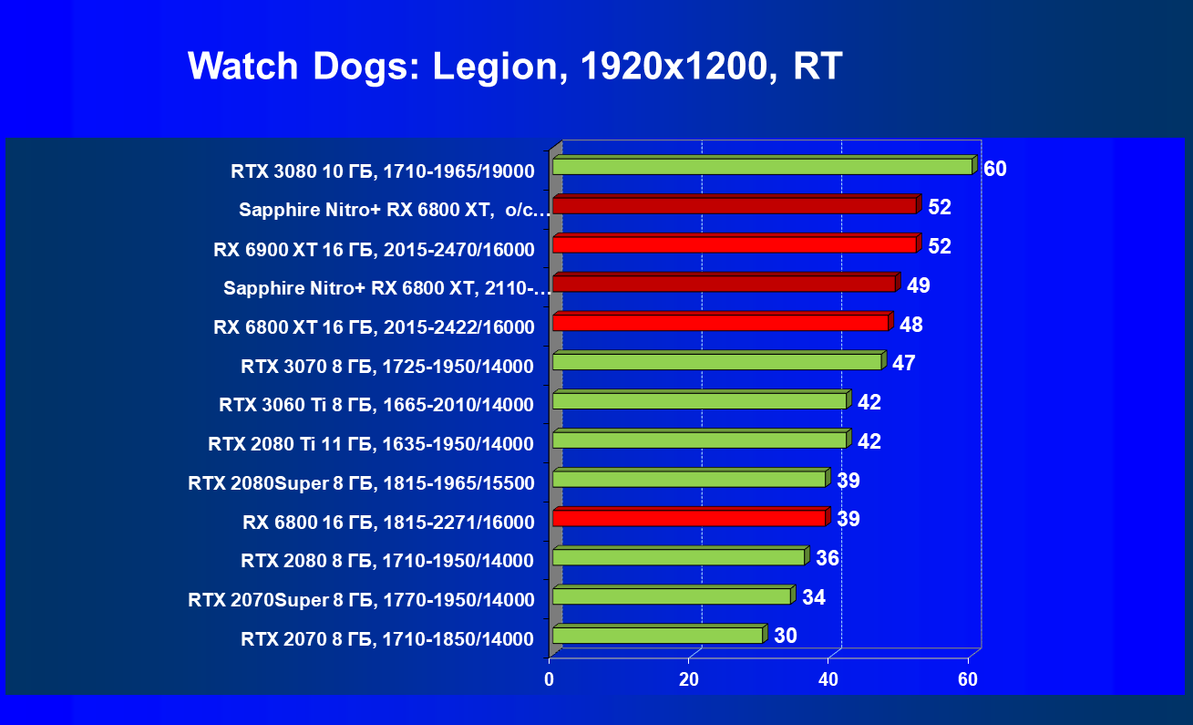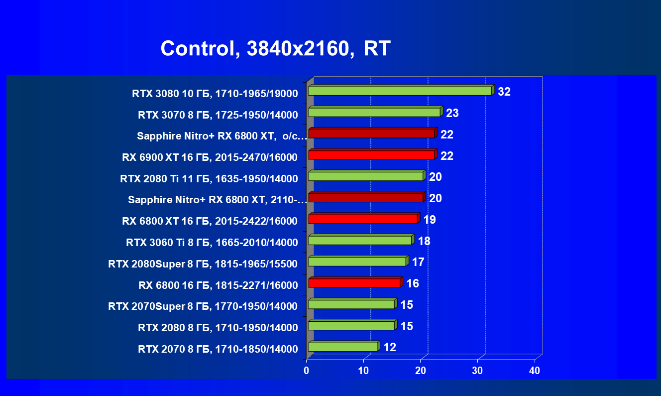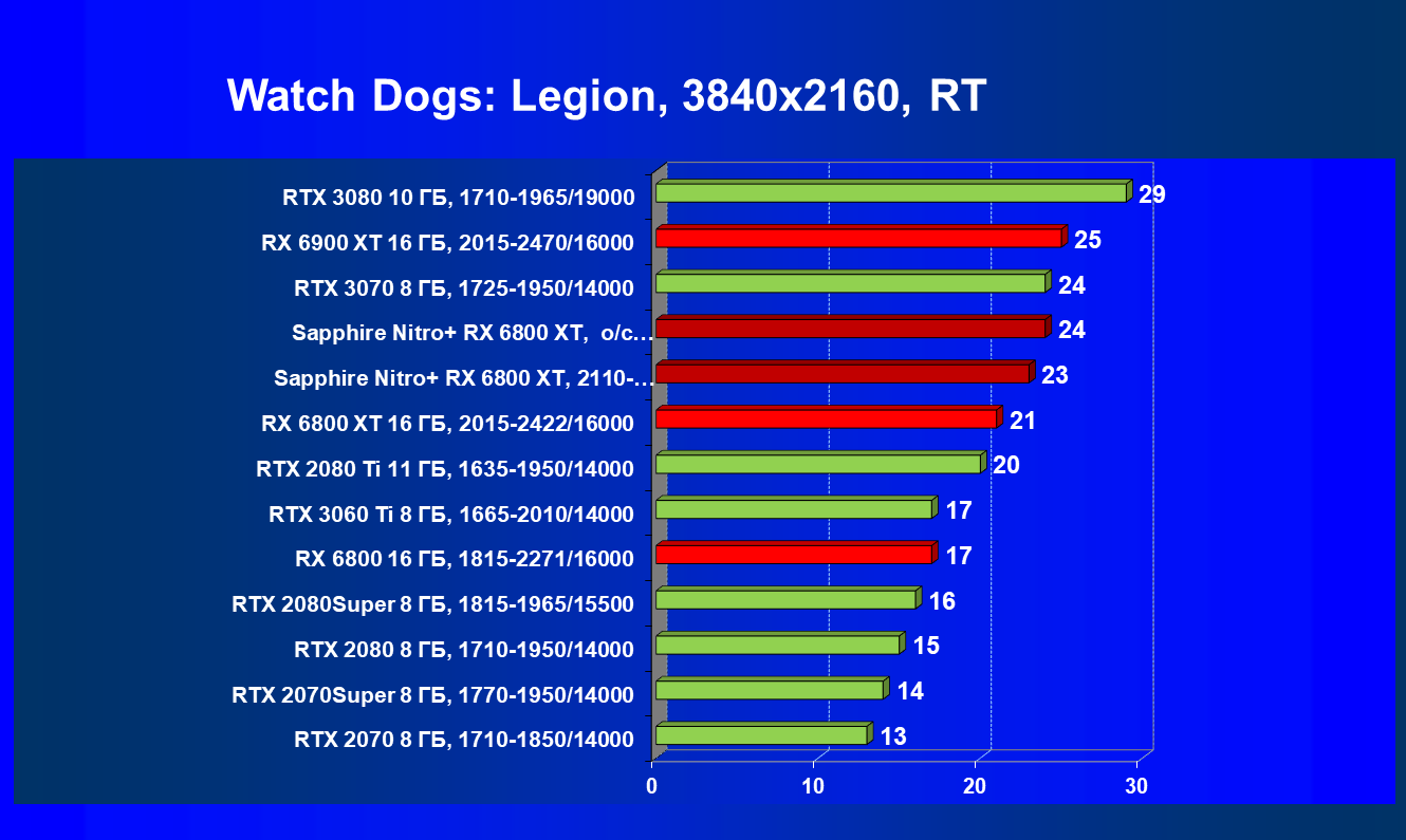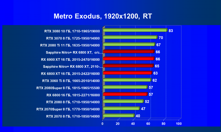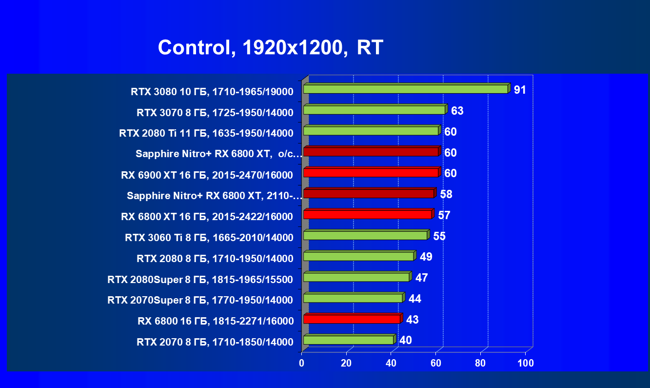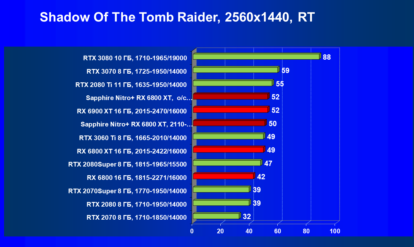 Nvidia GeForce RTX 3080 и AMD Radeon RX 6800 XT являются прямыми соперниками, они демонстрируют почти равную производительность, позволяющую комфортно играть в 4К при максимальных настройках графики, но только в игры без использования трассировки лучей (RT) — при включении трассировки лучей производительность Radeon 6800 XT может упасть до уровня GeForce RTX 3060 Ti. Видеокарта Sapphire немного более производительная, чем референсный аналог.