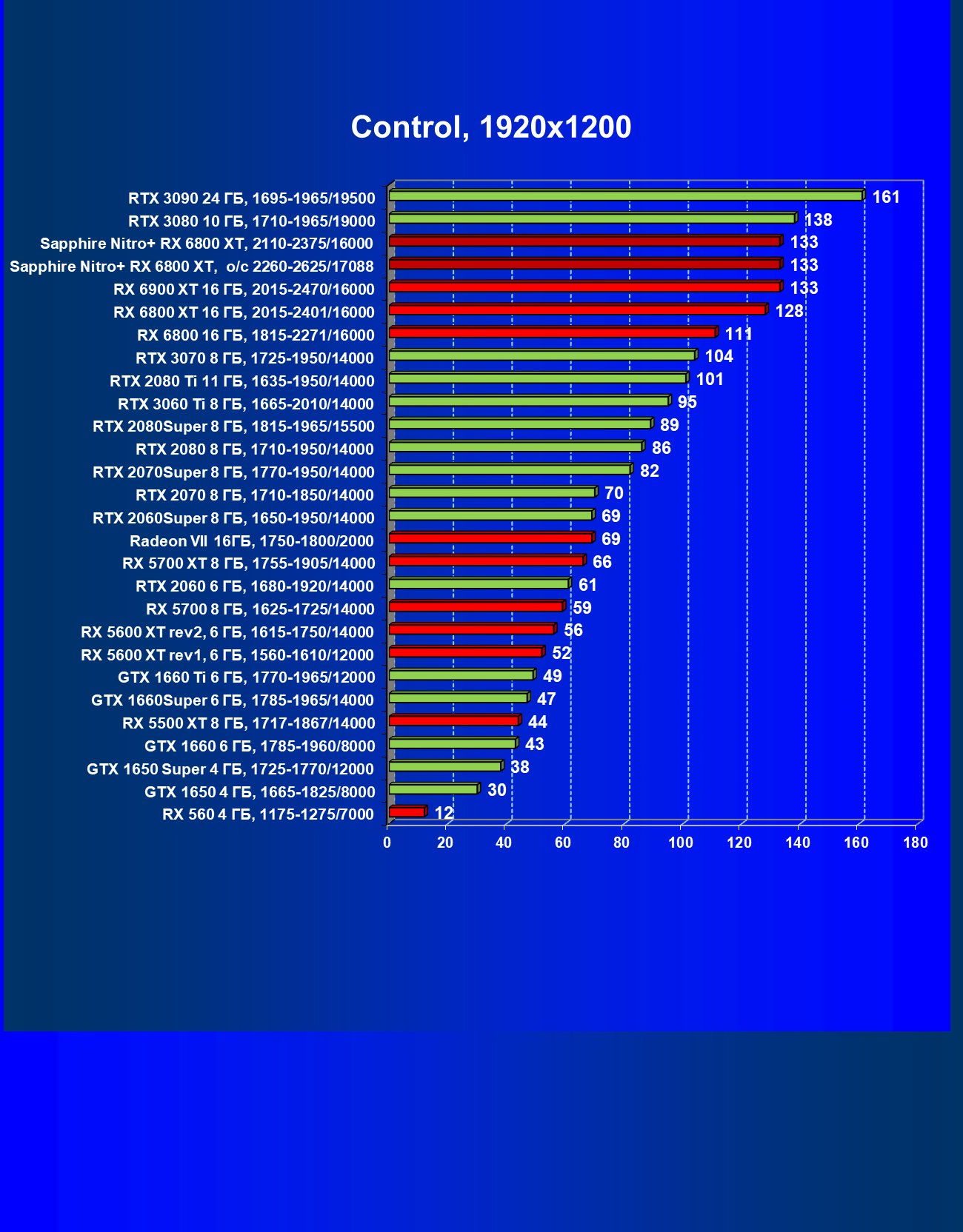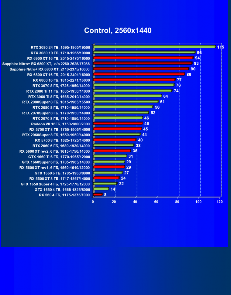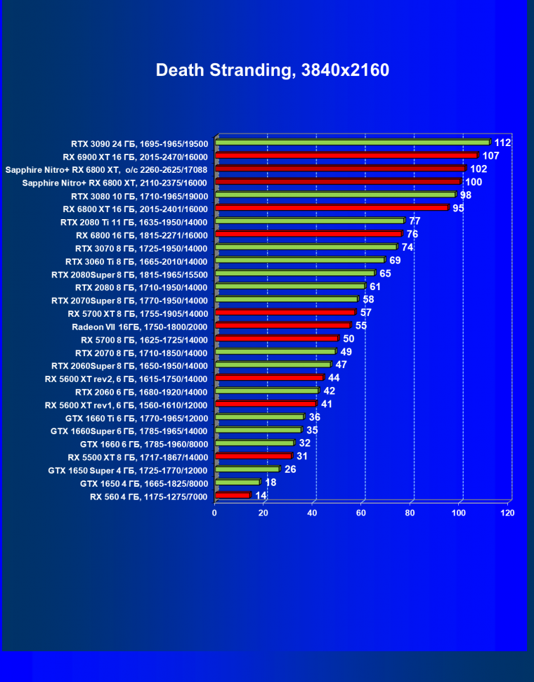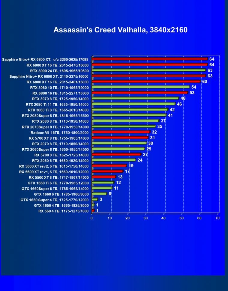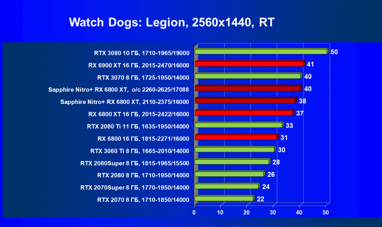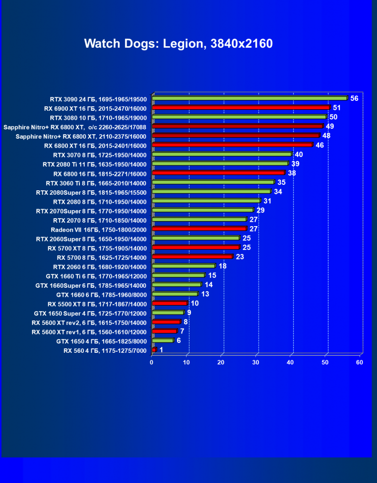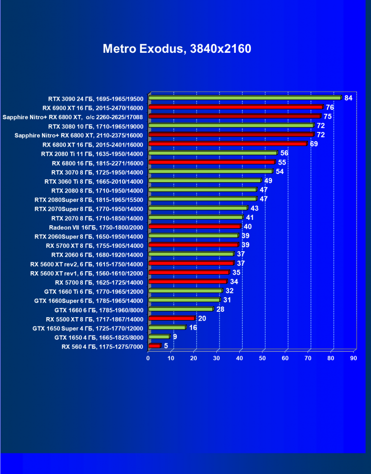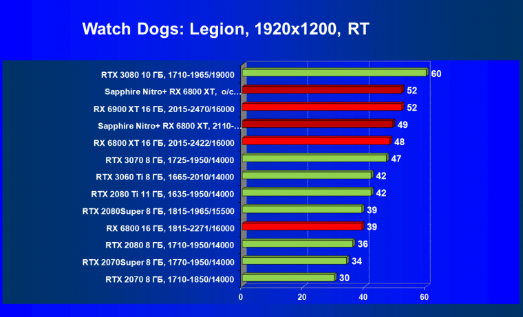 Nvidia GeForce RTX 3080 и AMD Radeon RX 6800 XT являются прямыми соперниками, они демонстрируют почти равную производительность, позволяющую комфортно играть в 4К при максимальных настройках графики, но только в игры без использования трассировки лучей (RT) — при включении трассировки лучей производительность Radeon 6800 XT может упасть до уровня GeForce RTX 3060 Ti. Видеокарта Sapphire немного более производительная, чем референсный аналог.