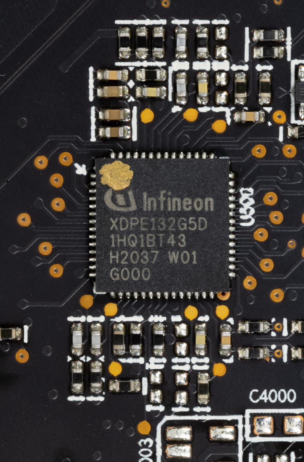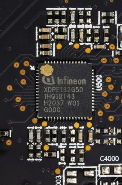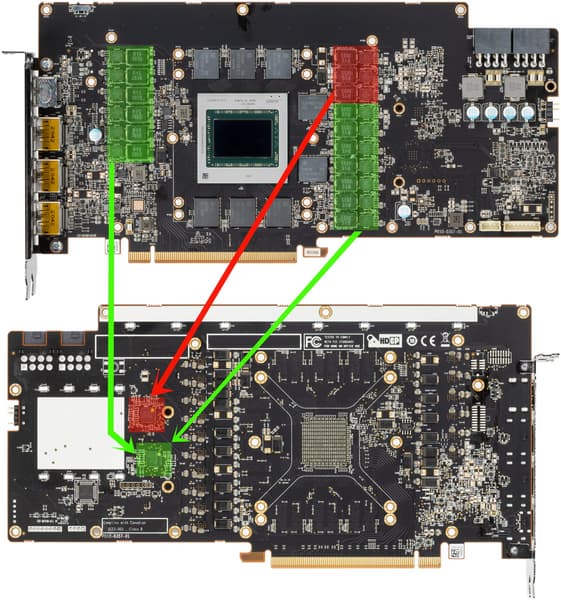 Зеленым цветом отмечена схема питания ядра, красным — памяти. 16-фазный ШИМ-контроллер XDPE132G5D (Infineon) управляет 13 фазами питания GPU (сам контроллер расположен на оборотной стороне PCB).