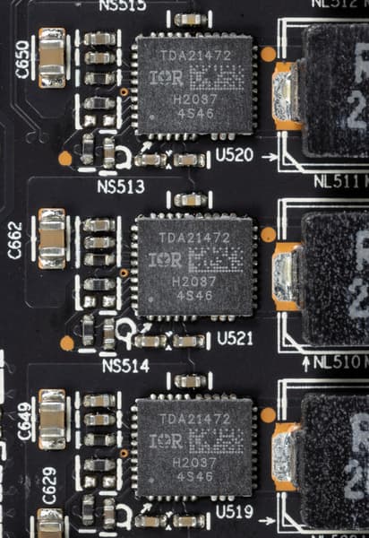 В преобразователе питания, традиционно для всех современных видеокарт, используются транзисторные сборки DrMOS — в данном случае TDA21472 (все того же IR/Infineon).