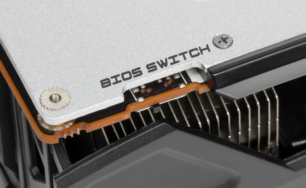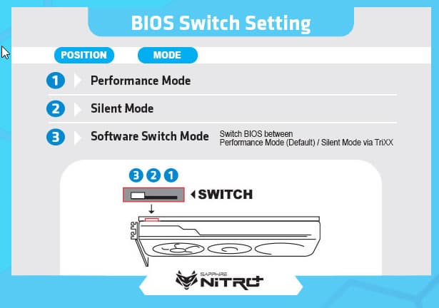 Версии Performance/Silent отличаются не только диапазонами частоты ядра, но и кривыми работы вентиляторов, а также лимитами потребления. По умолчанию переключатель стоит в положении «3», позволяя фирменной утилите Trixx управлять выбором копии BIOS для загрузки.
